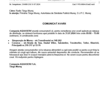 Sistare de apă astăzi pe str.Transilvaniei nr. 148-262