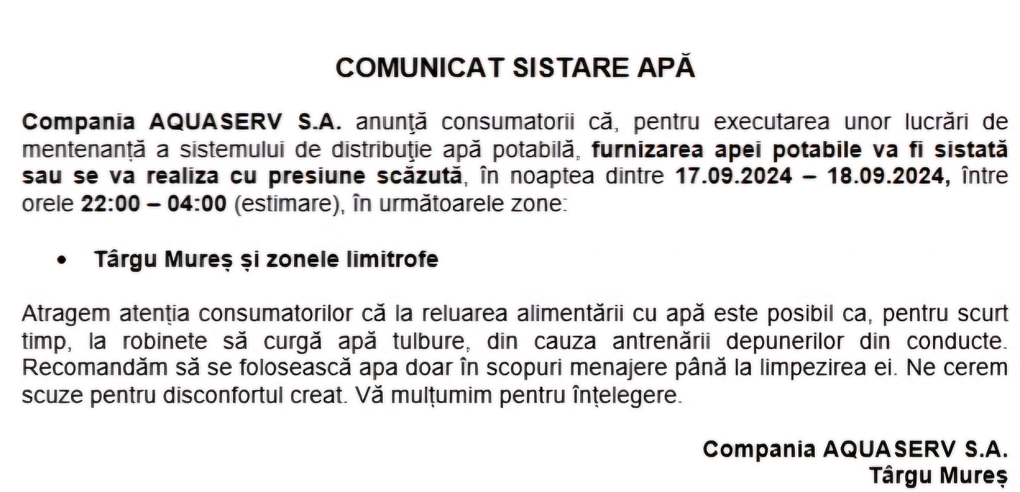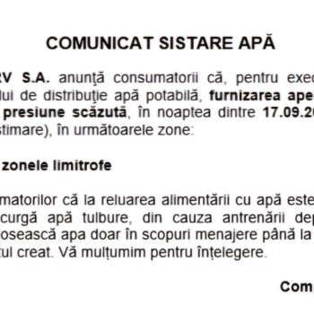 SISTARE de apã în TOATĂ COMUNA SÂNGEORGIU DE MUREȘ și multe alte localități din zonă, MÂINE, MARȚI (17.09.2024) NOAPTEA!