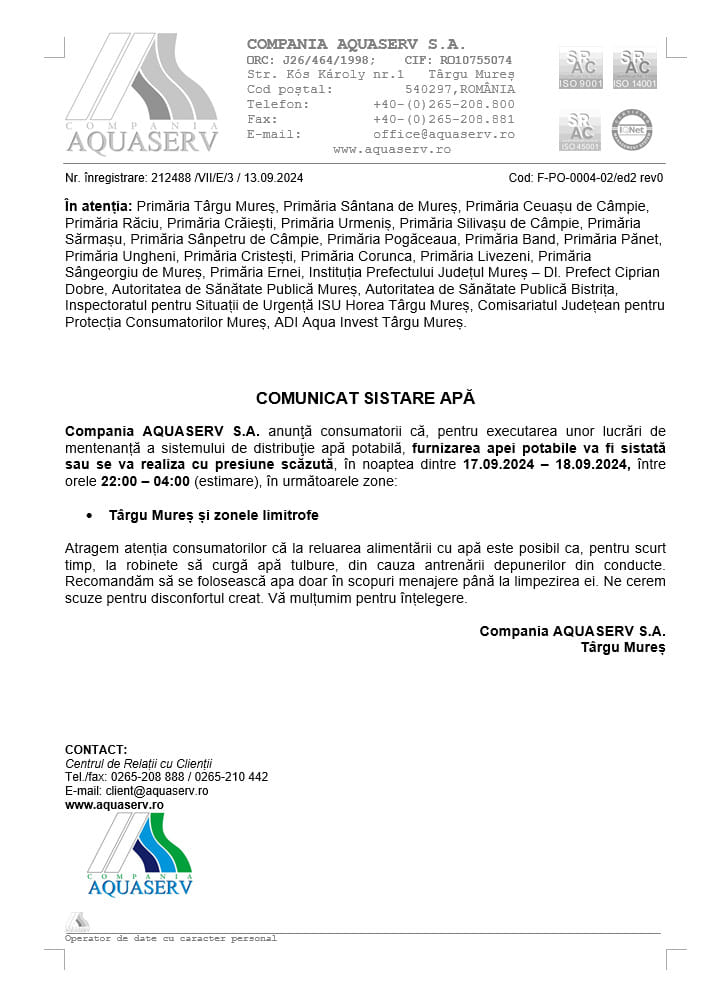 Detalii în comunicatul Companiei Aquaserv
