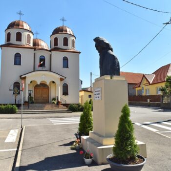 Poet Național, considerat ca fiind cea mai cunoscută și influentă personalitate din literatura română.Inițiativa realizari statui aparține celor două parohii ortodoxe și Asociației Culturale Sfântul Gheorghe.Statuia a fost realizat de sculptorul Ion Vlasiu,a fost inaugurat in anul 2021 august.Se afla pe str Căminului în fața biserici ortodoxe nr.2.