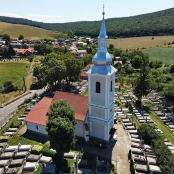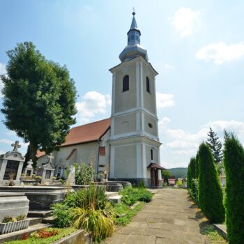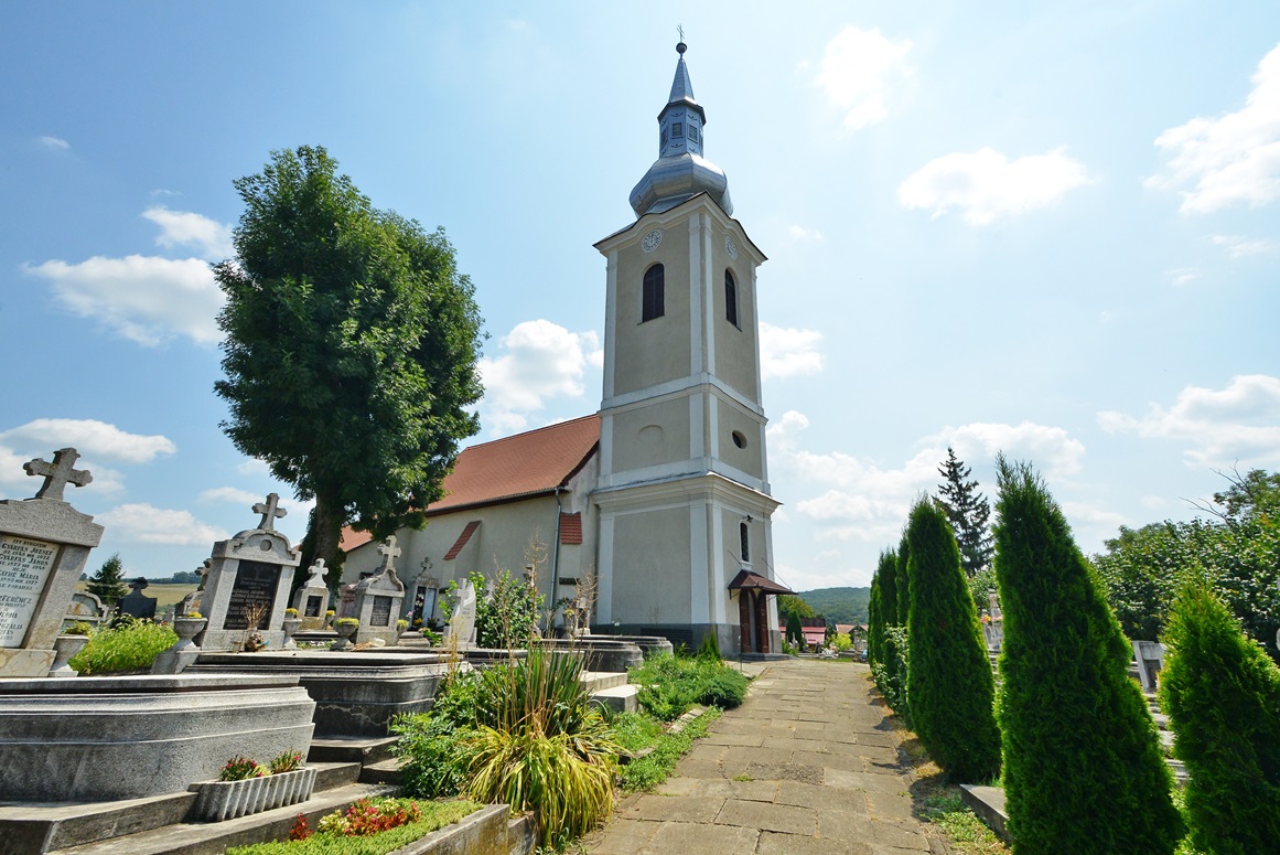 Primul document scris datează din 1332, când deja exista o biserică de sine stătătoare. Absida sub formă de semicerc a sanctuarului și fereastra splendidă în stil roman dovedesc existența bisericii în acea perioadă. Naosul a fost construit probabil în anul 1442. Bolta nu este nici gotică, nici romană, fiind o soluție intermediară. Intrarea principală de sub turn este realizată din piatră cioplită în stil gotic. Turnul a fost construit în anul 1823. În 1556 biserica a aparținut luteranilor, între anii 1572 și 1720 reformaților, când contele Petki Dávid, stăpânul de atunci al satului a dispus „recatolicizarea” și renovarea acesteia. Atunci s-a realizat și tavanul în casete, altarele în stil baroc, amvonul și strana.